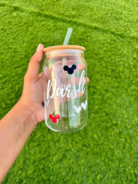Personalised Glass Cola Can Sipper with Wooden Lid & Glass Straw – Custom Name Juice, Coffee, Shake Bottle