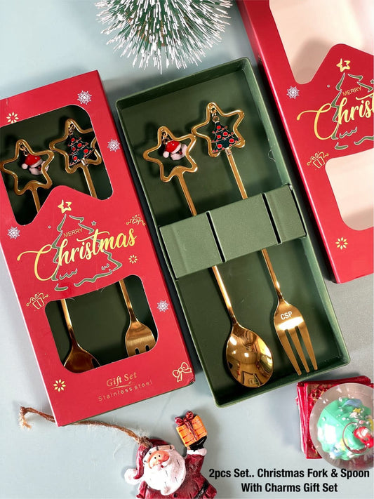 Christmas Special Stainless Steel Charms Spoon & Fork Set in Elegant Gift Box (Set of 2)