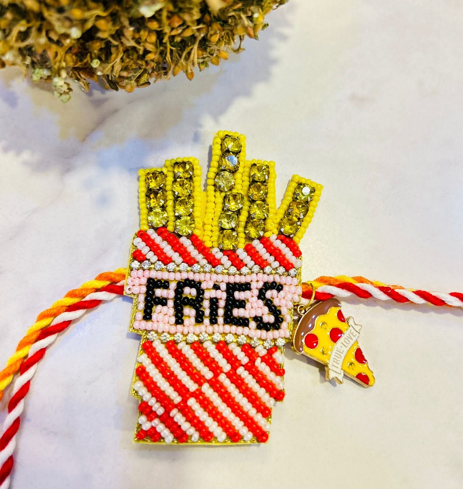 KN-34 ๐ Quirky French Fry Rakhi with Metal Pizza Charm โ Fun Rakhi for Kids & Brothers 2025