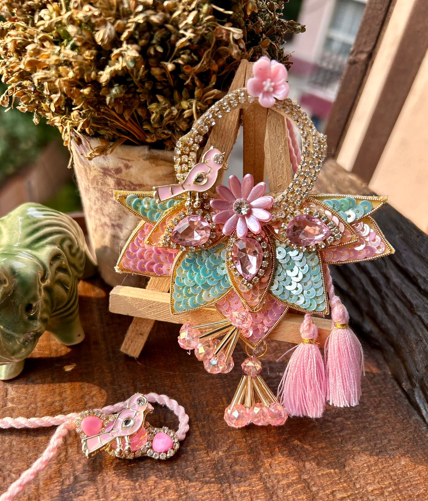 Gracefully crafted and beautifully detailed, this metal bird Rakhi is a perfect fusion of elegance and tradition. Featuring delicate sequined buti work, it's a refined choice for siblings who appreciate timeless, graceful design.