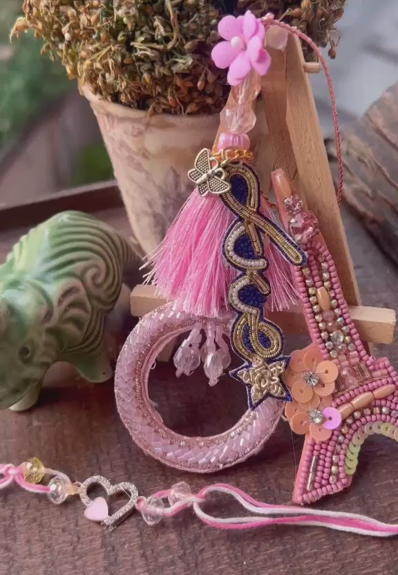 Add a dash of French flair to your Raksha Bandhan with our “Bhabhi in Paris” Lumba-Rakhi Set, featuring a stylish hand zardosi ‘LOVE’ patch, paired with elegant elements that channel Parisian vibes. Perfect for Bhaiya-Bhabhi who love all things luxe and fashionable!